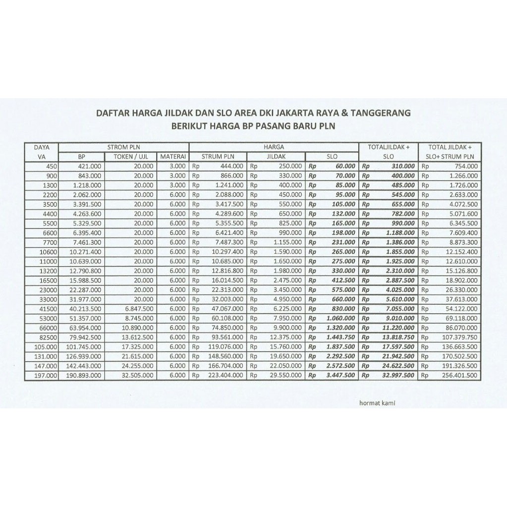 Caranya adalah dengan membagi jumlah penggunaan daya dengan 1.000, atau 20.950 : Untuk menghitung biaya listrik anda perlu merubah satuan watt menjadi kilowatt per hour atau kwh. 350 watt + 8400 watt + 300 watt + 400 watt + 8000 watt + 3000 watt = 20450 watt. Jumlah watt = (100 watt x 4 jam)/1000 = 0.4 kwh. Biaya listrik = total kwh x tarif listrik.